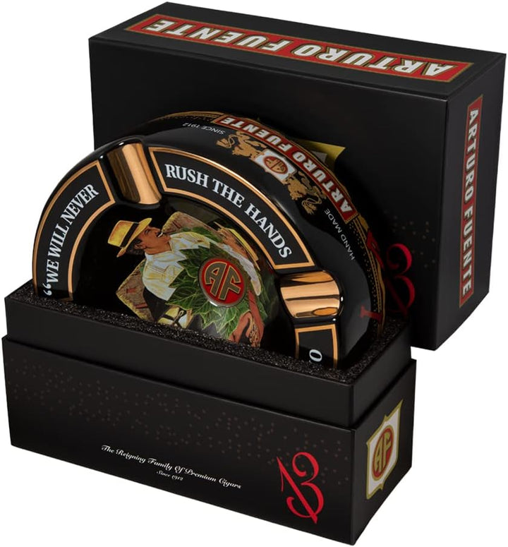 Elevate your cigar experience with this stunning Limited Edition Arturo Fuente Ceramic Ashtray, a sophisticated accessory crafted for the discerning aficionado. Measuring an impressive 22.5 cm, this large-format piece offers ample space for multiple cigars and ash, making it ideal for leisurely smoking sessions or entertaining guests. The premium porcelain construction combines durability with refined aesthetics, while the classic black finish complements any décor—from a gentleman's study to a contemporary lounge. Bearing the prestigious Arturo Fuente name, this exclusive ashtray serves as both a functional essential and a statement piece that celebrates your passion for premium cigars. A must-have for collectors and connoisseurs alike.