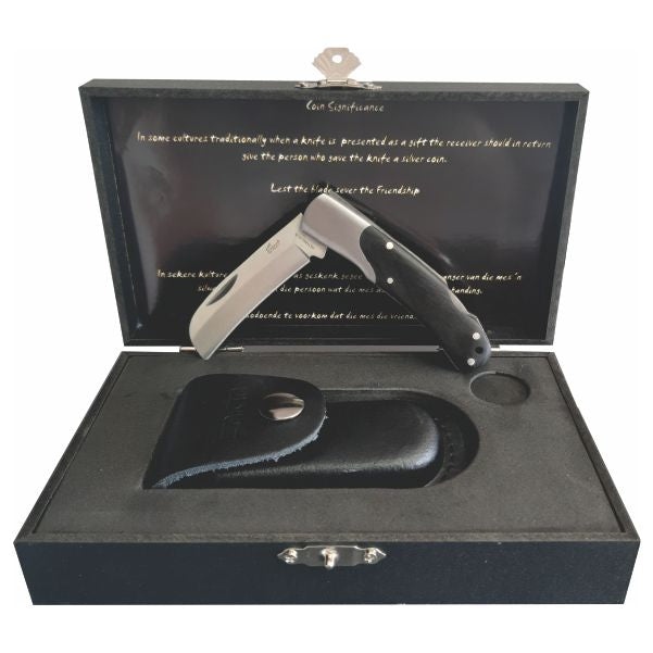 The ENLAN Biltong Pro features a sharp, single blade designed for precise biltong carving. This traditional, compact folding knife is perfect for any biltong enthusiast or handyman. It includes a genuine leather sheath and is presented in an elegant wooden gift box, making it an ideal and thoughtful gift.