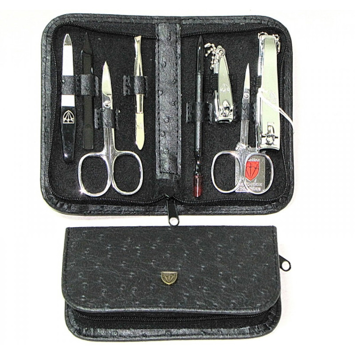 The Kellermann 3 Swords Manicure Set represents a curated selection of precision grooming instruments housed in a distinguished black faux leather case with ostrich-grain detailing. This professional-grade collection combines German engineering with refined aesthetics, delivering the tools and presentation expected by discerning users who demand both functionality and craftsmanship.