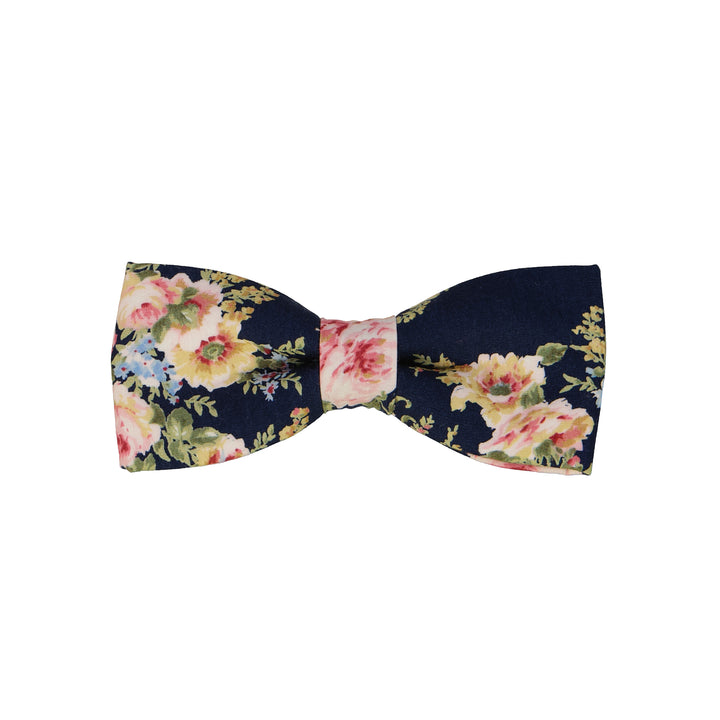 This navy floral bow tie brings understated personality to your formal wardrobe. Featuring delicate floral detailing against a deep navy base, it strikes the ideal balance between classic restraint and distinctive character. The intricate pattern works beautifully with charcoal or navy suits, adding visual interest without overwhelming your look. Expertly constructed for a polished appearance, it's equally at home at black-tie occasions or elevated casual events. A refined choice for the man who appreciates craftsmanship and subtle sophistication in his accessories.