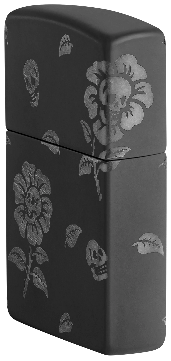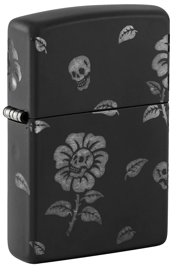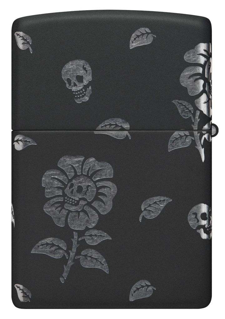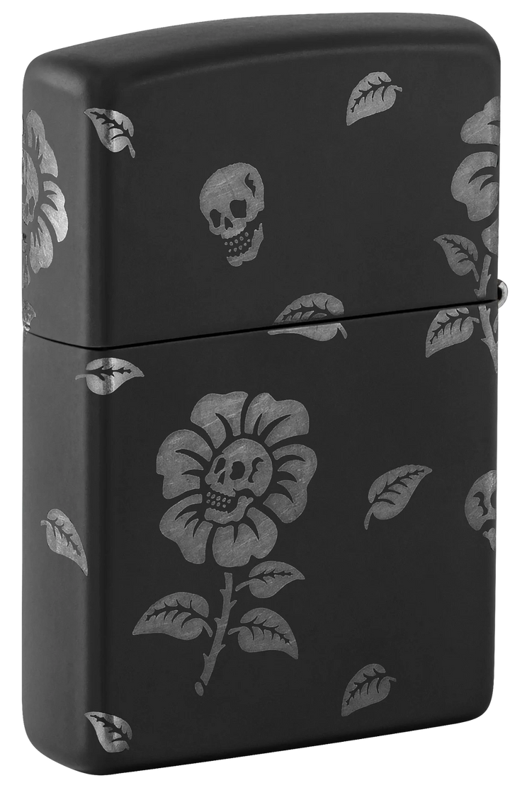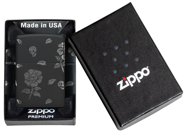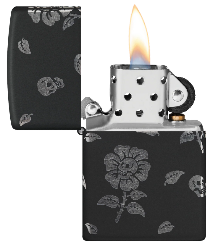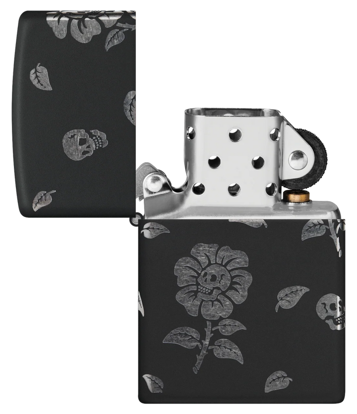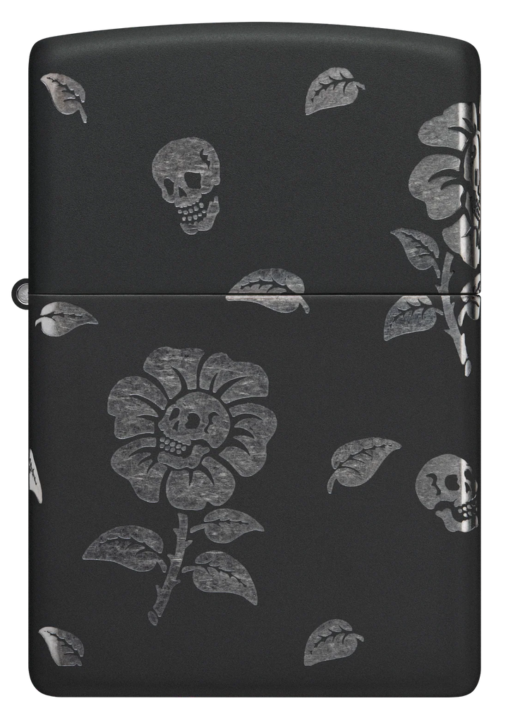 This Black Matte lighter features grinning skulls at the heart of blooming flowers, swirling elegantly around every side. Crafted with our Laser 360° technique, it exposes the lighter’s chrome hues beneath the smooth finish. Presented in a gift box, it performs best when filled with Zippo lighter fluid.